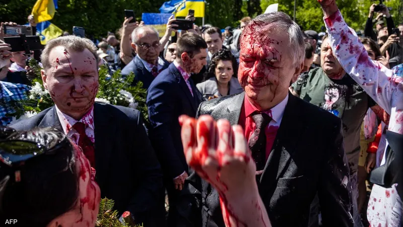 وتعرض السفير الروسي في بولندا للرش بمادة حمراء، الاثنين الماضي، من قبل أشخاص يحتجون على الحرب في أوكرانيا أثناء توجهه لوضع الزهور على المقبرة العسكرية السوفيتية في وارسو احتفالا بالذكرى السابعة والسبعين للانتصار على ألمانيا النازية، مما أثار رد فعل غاضبا من موسكو.
