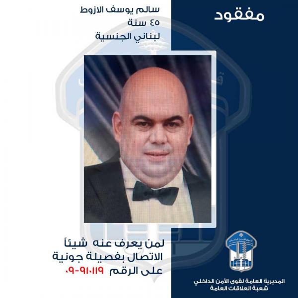 تعمم المديرية العامة لقوى الأمن الداخلي، بناءً على إشارة القضاء المختص، صورة المفقود: