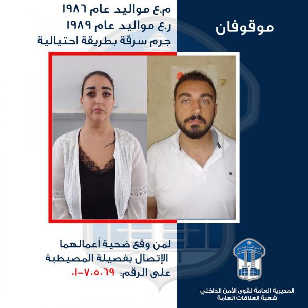 لذلك، تطلب هذه المديرية العامّة من الذين وقعوا ضحيّة أعمالهما وتعرّفوا إليهما، الحضور إلى مركز فصيلة المصيطبة الكائن في ثُكنة إميل الحلو- شارع مار الياس، أو الاتصال على الرقم 705069-01، تمهيداً لاتخاذ الإجراءات القانونية اللازمة.