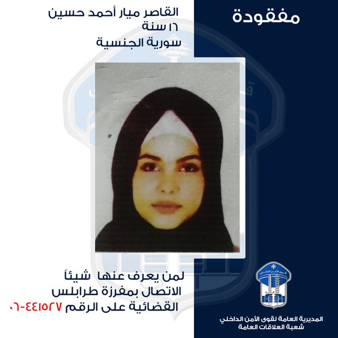 لذلك، يرجى من الذين شاهدوها ولديهم أي معلومات عنها أو عن مكانها، الاتصال بمفرزة طرابلس القضائية في وحدة الشرطة القضائية، على أحد الأرقام التالية: 441527-06 / 423039-06 / 443819-06، للإدلاء بما لديهم من معلومات.