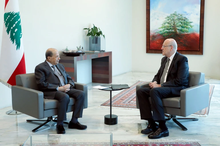 وكان الرئيس المكلف قد شدد إثر لقائه رئيس الجمهورية على أنّ "الخيارات ضيقة جداً والوقت مهم جداً"، وقال: "سلّمته تشكيلة الحكومة التي أراها مناسبة في هذه الظروف"، موضحاً أنّ عون استمهله "لدرسها" والعودة إليه. وما أن خرج ميقاتي من القصر الجمهوري حتى اشتعل فتيل "التسريب الإعلامي" بين بعبدا والسراي فكانت النتيجة احتراق "المسودة الوزارية الأولى" على وقع تبادل الاتهامات بين الجانبين حول الجهة التي سرّبتها، وكشفت بالأسماء والحقائب تشكيلة الـ24 التي اقترحها الرئيس المكلف على رئيس الجمهورية، فتبيّن أنها نسخة منقّحة عن حكومة تصريف الأعمال، اعتمدت مداورة طائفية بين حقيبتي الطاقة والاقتصاد، بحيث جرى إسناد الأولى إلى وليد سنو بدل وليد فياض، مقابل منح الطائفة الأرمنية الحقيبة الثانية وتحديداً لجورج بوشيكيان مكان أمين سلام، بينما بقيت حقيبة المال من حصة "الثنائي الشيعي" مع اقتراح اسم ياسين جابر بدل يوسف خليل، وانتقلت وزارة المهجرين من عصام شرف الدين (المحسوب على طلال أرسلان) إلى سجيع عطية، فضلاً عن تسمية وليد عساف لوزارة الصناعة.