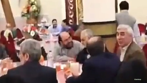 ويظهر في الفيديو، رجل بلحية بيضاء يتقدّم نحو طاولة يجلس حولها عدد من الأشخاص، وبينهم سليماني، ويسلّم عليهم.
