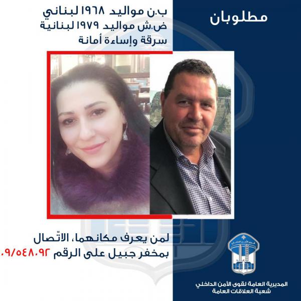 لذلك، تطلب هذه المديريّة العامّة مِمَّن شاهدهما أو يعرف مكانهما، الاتصال بمخفر جبيل في وحدة الدّرك الإقليمي على الرقم: 548092/09، للإدلاء بما لديه من معلومات، علماً بأن كل مواطن يساهم في إلقاء القبض عليهما، يبقى اسمه طيّ الكتمان وفقاً للقانون.