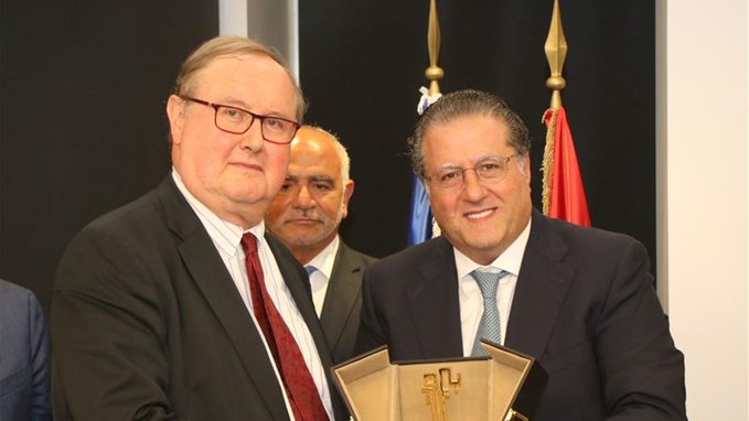 وفي نهاية الاجتماع، قدم شقير باسم الهيئات الاقتصادية درع بيروت إلى دوكان.