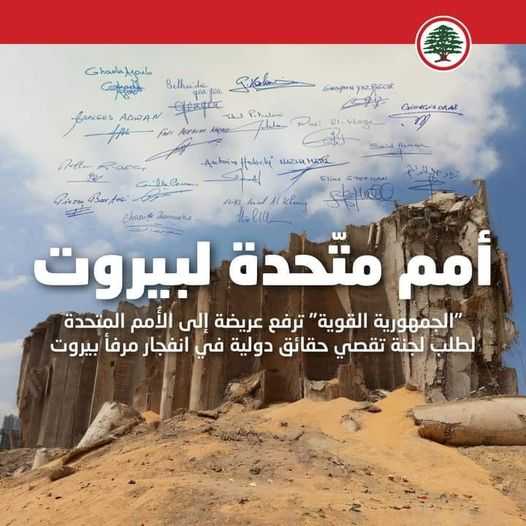 في هذا الاطار، وقّع نواب تكتل "الجمهورية القوية" امس على عريضة للمطالبة مجدّداً بتشكيل لجنة تقصّي حقائق دولية بانفجار 4 آب تساعد التحقيق المحلي، وهي منسّقة مع أهالي الضحايا. وجدد عضو تكتل الجمهورية القوية النائب جورج عقيص خلال مؤتمر صحفي من مجلس النواب يرافقه النائبان غادة أيوب ونزيه متى، دعوة الكتل الى التوقيع على العريضة قبل إرسالها إلى مجلس حقوق الإنسان. وقال عقيص لأهالي الضحايا "نحن معكم وسنستشرس بوجه السلطة من أجل تحقيق العدالة فزمن الإفلات من العقاب ولّى". واعتبر أن "القضاء معطّل والسلطة الحاكمة ترتكب اليوم جريمة أفظع من انفجار 4 آب نفسه بطمس معالم الجريمة ومنع الحقيقة وطالبنا منذ البداية بتشكيل لجنة تحقيق دولية".