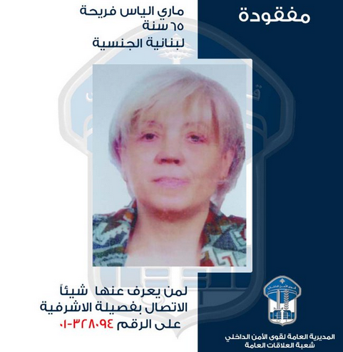 لذلك، يرجى من الذين شاهدوها أو لديهم أي معلومة عنها أو عن مكان وجودها، الاتصال بفصيلة الأشرفيّة في وحدة شرطة بيروت على الرقم: 328094-01، للإدلاء بما لديهم من معلومات.