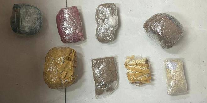 بتفتيش المنزل حيث يقيمون، عُثِرَ على كميّة من حشيشة الكيف زِنتها /٨٠٠/ غ، وكميّة من حبوب الكبتاغون زِنتها /١٤٠/ غ.