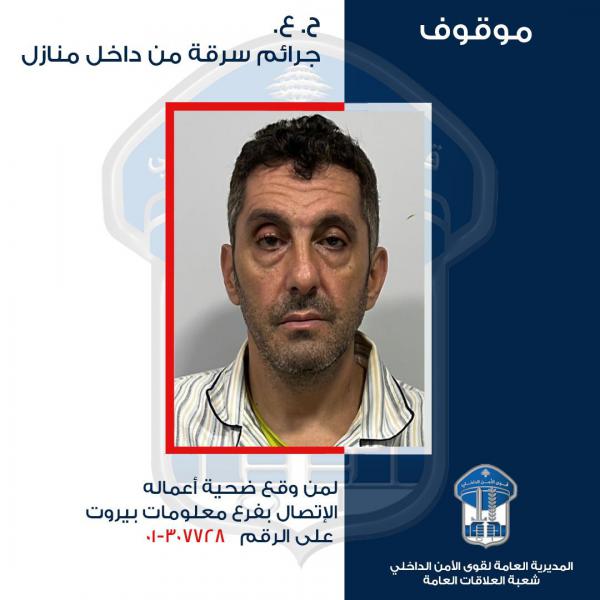 إلحاقا لبلاغنا الصادر بتاريخ 23-09-2022، حول تمكّن شعبة المعلومات في قوى الأمن الداخلي من كشف هوية وتوقيف منفّذ عدد من سرقات المنازل ضمن مدينة بيروت الذي يستغل طبيعة عمله كسمكري، ويدعى: