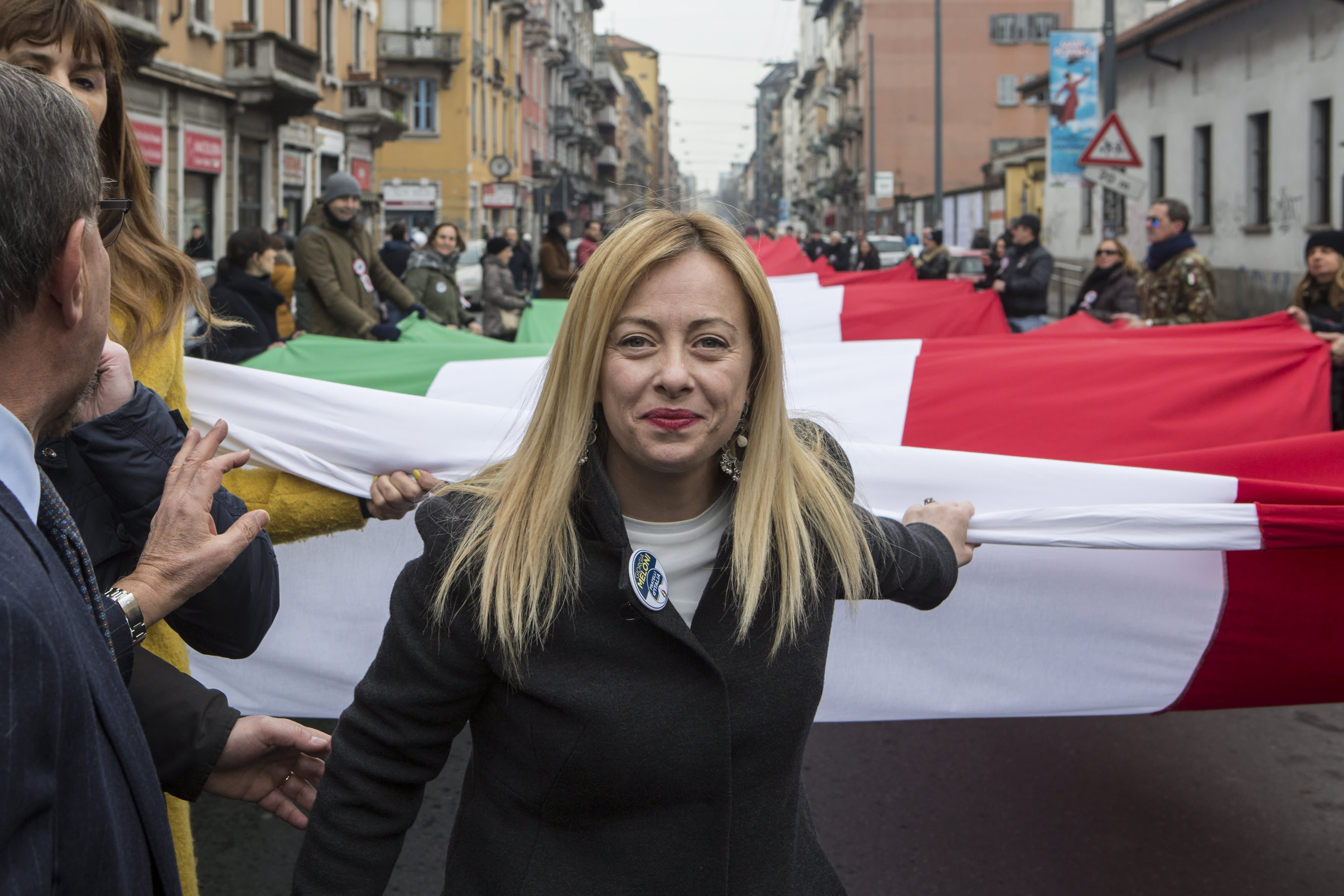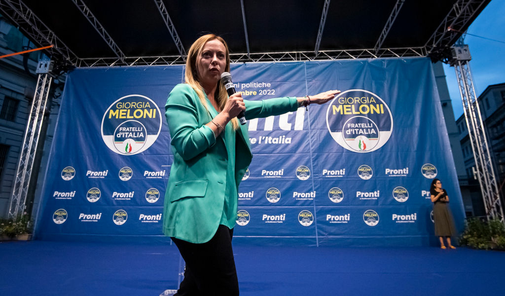 جيورجيا ميلوني، زعيمة حزب فراتيلي ديتاليا الإيطالي اليميني المتطرف (أخوة إيطاليا)، خلال مسيرة كجزء من حملة الانتخابات العامة، أيلول 2022/ Getty