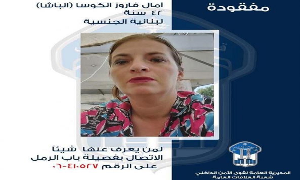 عممت المديريـة العامة لقوى الأمن الداخلي ـ شعبة العلاقـات العامة، في بلاغ، بناءً على إشارة القضاء المختص، صورة المفقودة: