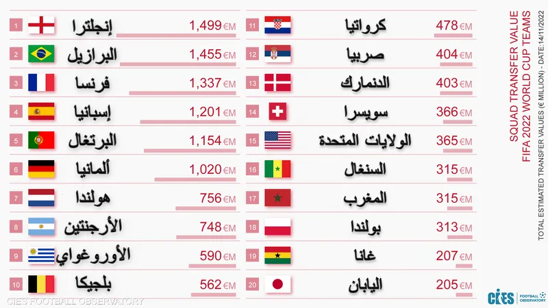 وتم تحديد القيمة الإجمالية لجميع المنتخبات في كأس العالم بنحو 15 مليار يورو.
