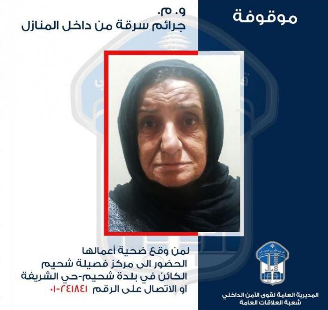 لإقدامها على عدة عمليات سرقة من داخل منازل ضمن مناطق مختلفة في عدة محافظات، وهي أيضًا من أصحاب السوابق بجرم سرقة.