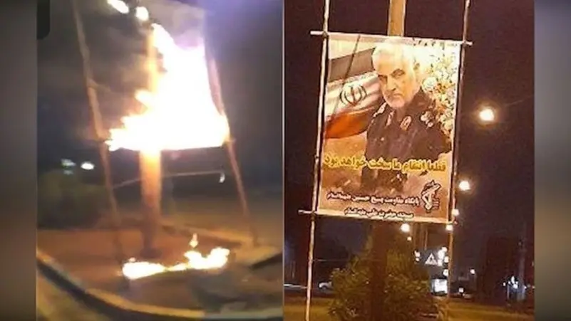 وأشعل المتظاهرون، مساء الجمعة، النار أيضًا في لافتة تحتوي على دعاية عليها صورة قاسم سليماني، القائد السابق لفيلق القدس التابع للحرس الثوري الإيراني، على طريق الإمام علي السريع في طهران.