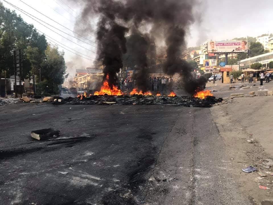 قطع الطريق في محلة الجناح أول جسر الماريوت بواسطة الاطارات المشتعلة من قبل بعض المحتجين