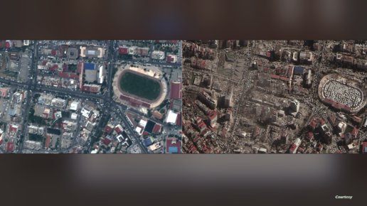 ونشر موقع Disaster Charter صورا لمنطقة اللاذقية السورية المدمرة بشكل كبير بسبب الزلزال.