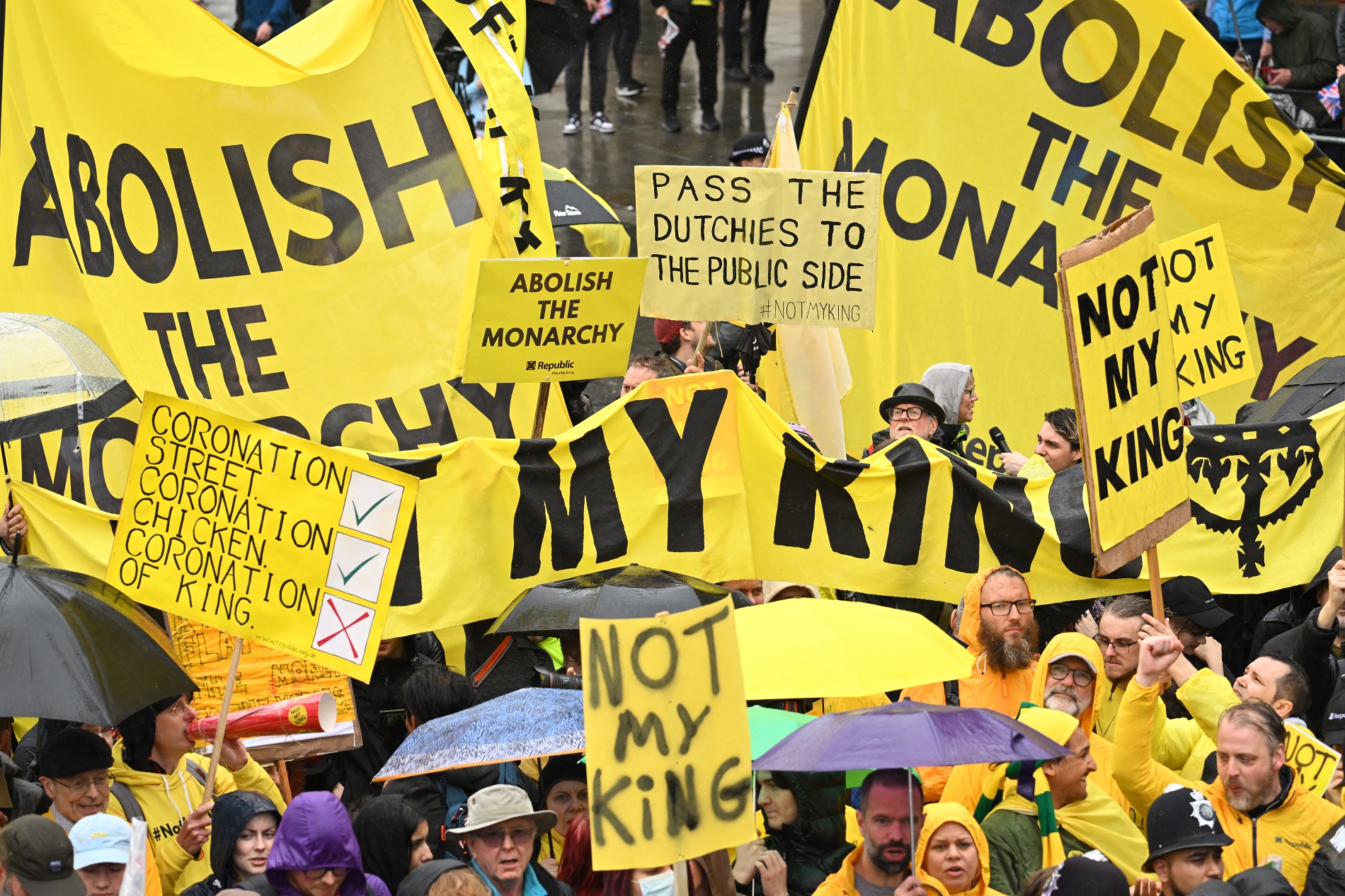 تجمع متظاهرون في لندن، السبت، للاحتجاج على تتويج الملك تشارلز الثالث. ورفعوا لافتات كُتب على بعضها عبارة “ليس ملكي”، ويأتي ذلك وسط حالة تأهب قصوى تشهدها العاصمة البريطانية، لندن، على وقع مراسم التنصيب التي تحظى بمتابعة الملايين في المملكة المتحدة والعالم، في إحياء لتقاليد تعود إلى أكثر من 1000 عام مضى.