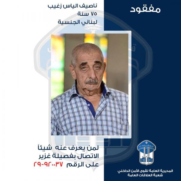 الذي غادر بتاريخ 10-06-2023، منزله الكائن في محلة غزير-شارع مار الياس إلى جهة مجهولة، ولم يعد لغاية تاريخه. علمًا أنه أصمّ ويعاني صعوبة في النطق والبصر.