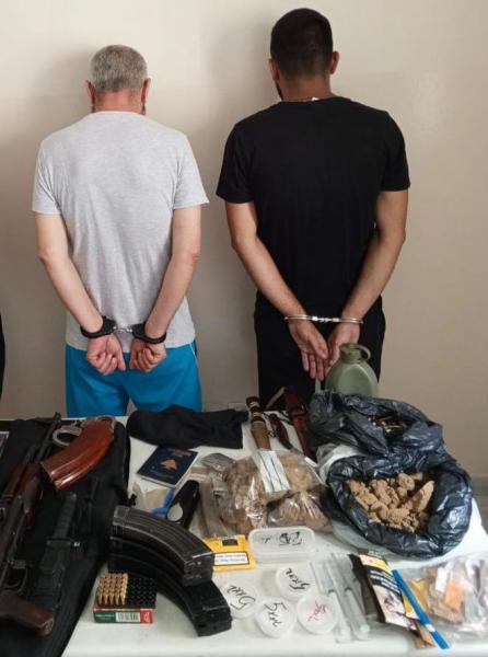 بتفتيش الشّقّة، عثرت على: /2/ كلغ من مادّة حشيشة الكيف، كميّة من مادتي الكوكايين الماريجوانا، ميزان حسّاس عدد /2/، بندقيّة كلاشنكوف ومسدّس حربي.