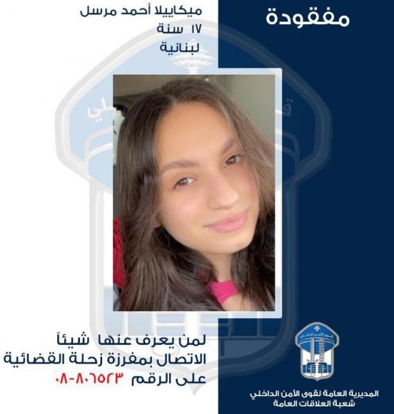 تُعمِّم المديرية العامّة لقوى الأمن الداخلي بناءً على إشارة القضاء المختص صورة المفقودة القاصر: