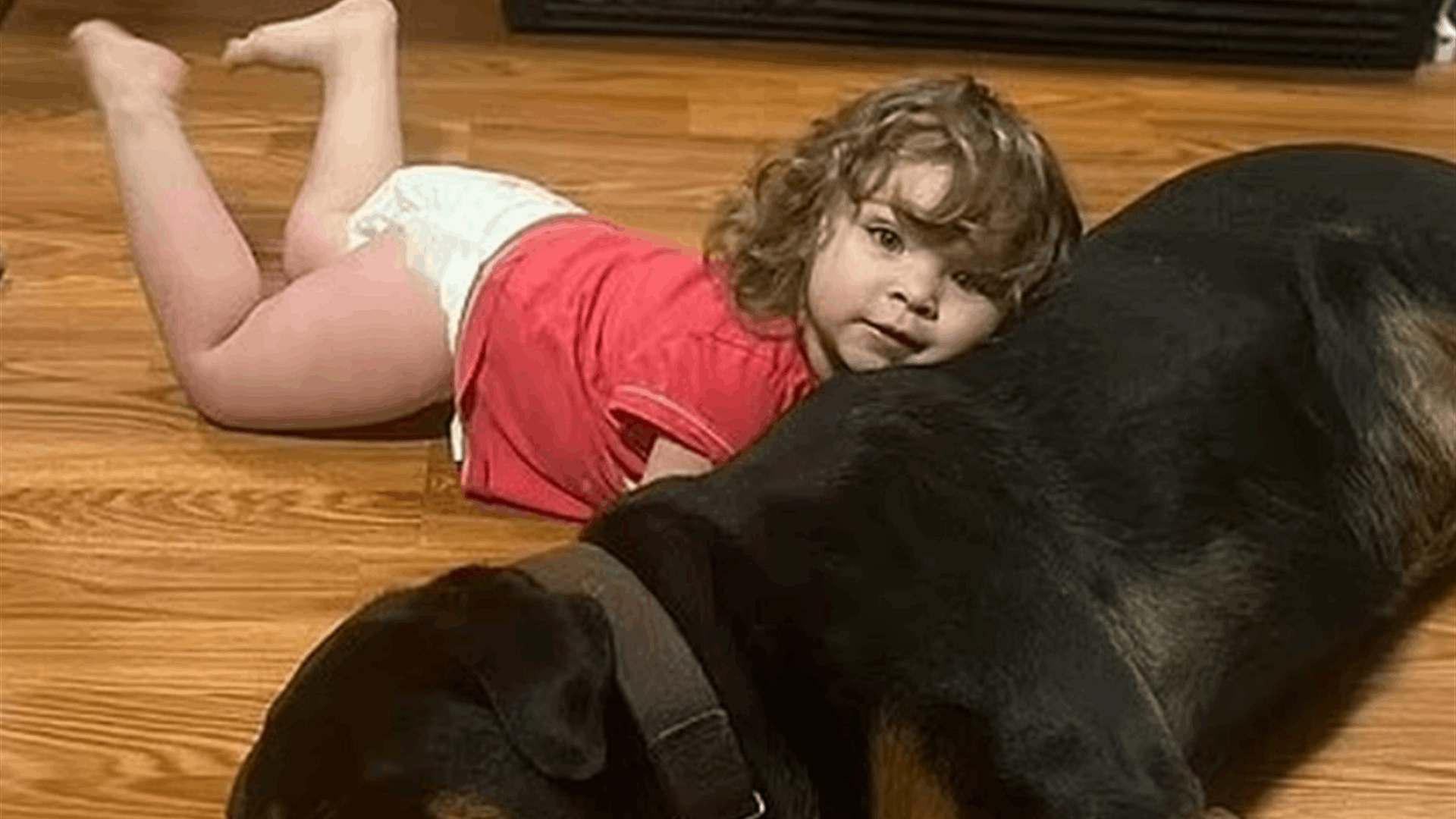 وكانت تنام على كلبة من فصيلة الروت وايلر ةالتي تدعى بادي، بينما كان الكلب الآخر يراقبها ويحرسها.