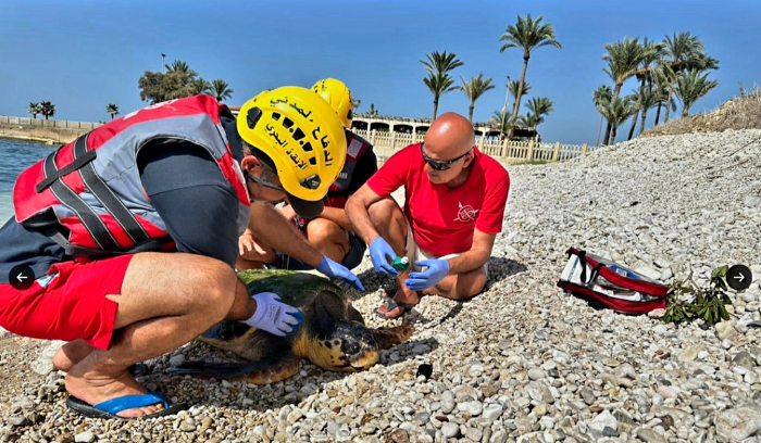 وقد باشرت العناصر العمل على هذه المهمة منذ ثلاثة أيام وتقديم الاسعافات اللازمة للسلحفاة.