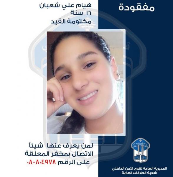 تعمّم المديريّة العامّة لقوى الأمن الدّاخلي، بناءً على إشارة القضاء المختص، صورة المفقودة القاصر: