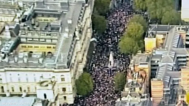 وقالت شرطة العاصمة البريطانية إن ما يقدر بنحو 100 ألف متظاهر تجمعوا بعد ظهر السبت للاحتجاج، مع توجه الموكب من قوس ماربل آرك نحو طريق وايت هول.