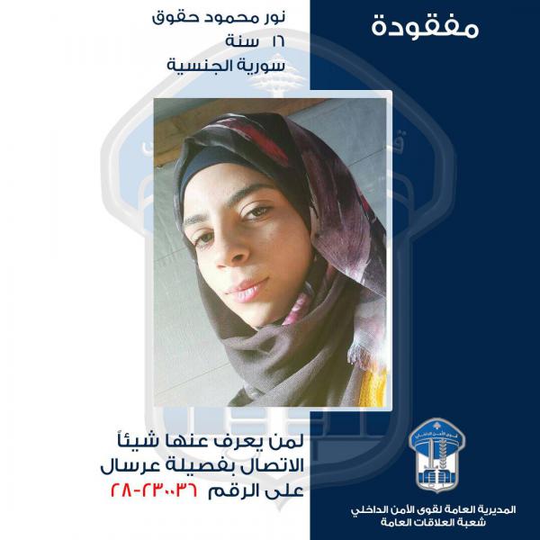 صدر عن المديرية العامة لقوى الأمن الداخلي ـ شعبة العلاقات العامة البلاغ التالي: "تعمِّم المديريّة العامّة لقوى الأمن الداخلي بناء على إشارة القضاء المختص صورة المفقودة القاصر نور محمود حقوق (مواليد عام 2007، سورية) التي غادرت بتاريخ 16/11/2023 مكان إقامتها في مخيم "قرية حياة" للنازحين السوريين في بلدة عرسال، ولم تعد لغاية تاريخه.