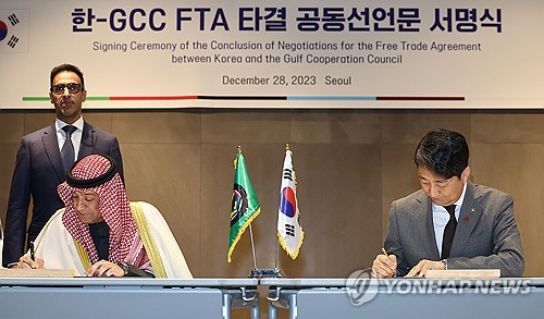 وقالت وزارة التجارة والصناعة والطاقة :"إن وزير التجارة الكوري الجنوبي آن دوك-غيون والأمين العام لمجلس التعاون لدول الخليج العربية (GCC) جاسم محمد البديوي وقعا إعلانا مشتركا بشأن إبرام اتفاقية التجارة الحرة الثنائية في سيول اليوم الخميس".