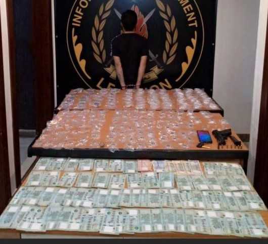 بتاريخ 08-01-2024 وبعد عملية رصد ومراقبة دقيقة، أوقفته إحدى دوريات الشعبة بالجرم المشهود في محلة الكفاءات، أثناء قيامه بترويج المخدرات على متن دراجة آليّة لون أسود تم ضبطها. وبتفتيشه والدراجة، عثر على ما يلي: