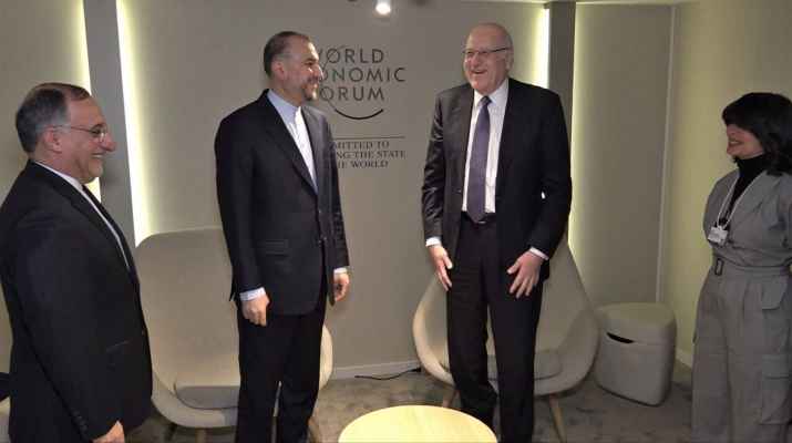 اجرى وزير الخارجية الإيراني حسين أمير عبد اللهيان محادثات مع رئيس حكومة تصريف الأعمال نجيب ميقاتي، على هامش منتدى دافوس في سويسرا، وفق ما نقلت وكالة الأنباء الإيرانية الرسميّة- إرنا.