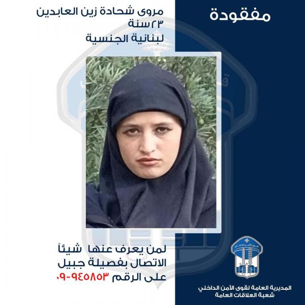 تُعمّم المديرية العامة لقوى الأمن الداخلي بناءً على إشارة القضاء المختصّ صورة المفقودة: