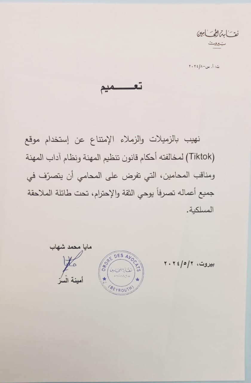 تحت طائلة الملاحقة المسلكية، طلبت #نقابة المحامين في بيروت من أعضائها، اليوم، الامتناع عن استخدام تطبيق "#تيك توك" لمخالفته أحكام قانون تنظيم المهنة ونظام آداب المهنة ومناقب المحامين، التي تفرض على المحامي أن يتصرف في جميع أعماله تصرّفاً يوحي الثقة والاحترام.