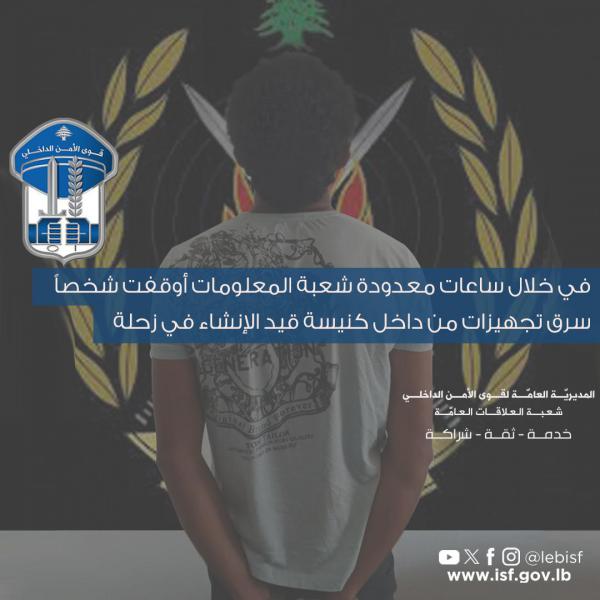 "بتاريخ 10- 07- 2024، أقدم مجهول، على متن سيارة نوع "رينو كانغو" لون أبيض، على الدخول إلى حرم كنيسة قيد الإنشاء في زحلة، وسرق من داخلها تجهيزات مصنوعة من الحديد.